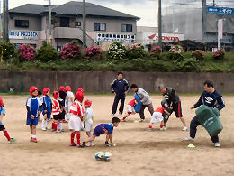 大会には、北九州市の2つのクラブ、山口県内の5つのクラブが参加、全部で150名の小学生とその保護者が集まりました。小学生は、学年ごとに低学年(1・2年生)9チーム、中学年(3・4年生)7チーム、高学年(5・6年生)6チームに分かれ、計6つのグランドで午前10時から午後3時まで熱戦を繰り広げました。ラグビー部の学生は、3つのグランドのタッチジャッジと得点の記録係を務めました。