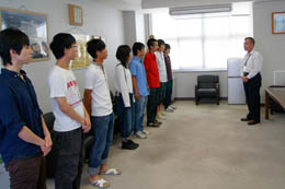 その後、消火器を使い初期消火訓練を実施しました。各寮棟の代表者が「火に近づき過ぎないように」、「風上から消火をするように」など指導を受けながら訓練を実施しました。