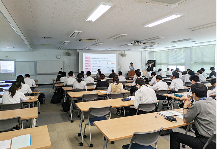 1日目の午前は、本校を日ごろから支援していただいているテックアンドビジネスコラボレイト(T&B)外部リンクの会員企業である株式会社山口銀行外部リンク株式会社宇部情報システム外部リンク太陽石油株式会社外部リンク株式会社山産外部リンク戸田工業株式会社外部リンクの社員の方々(人事担当、卒業生)にお越しいただき、本校の教室で講話をしていただきました。