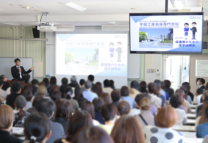また、併せて実施した保護者のための進学説明会では、本校の特色や入試の内容、学生の活動、国際交流について説明し、多くの保護者の方が真剣に耳を傾けていました。