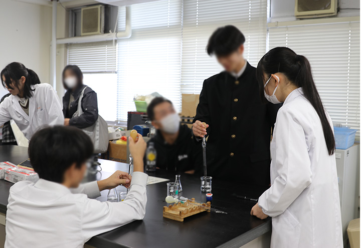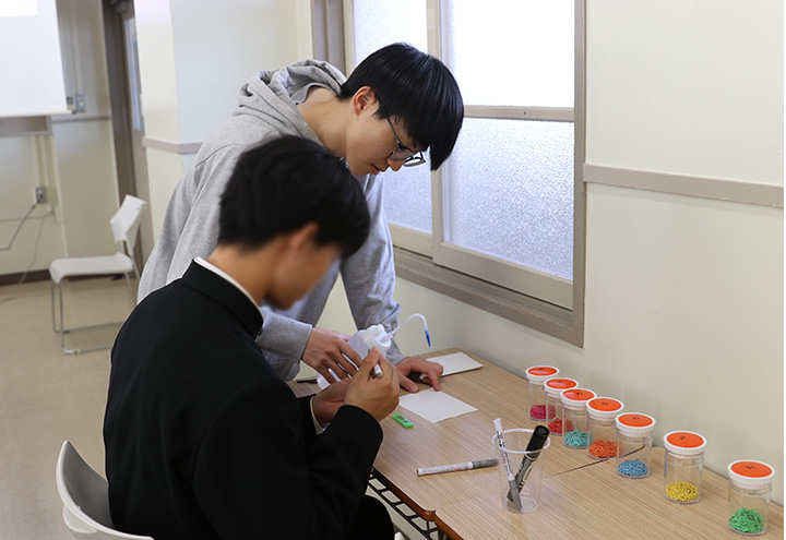 午後は各学科による体験学習を実施しました。参加者は27のテーマの中から興味のあるものを選び、授業で使用する装置の体験、ロボット操作のためのプログラム製作、白衣を着て行う化学実験、コンピュータを使った実習、在学生との座談会などを通して、高専ならではの学習内容や魅力を体感していただきました。