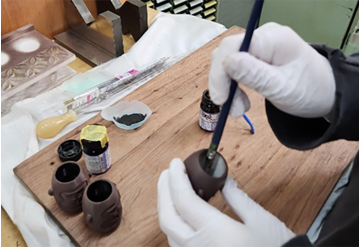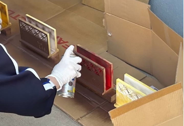 学生たちは、お店のモチーフであるゴリラをデザインした爪楊枝入れ3個と、店名ロゴと縁起の良い「七宝繋ぎ」をデザインしたメニュー表立て5個を3Dプリンターで製作しました。製作の工程では、先輩や先生にも協力いただき、試作と調整を重ねて完成させました。