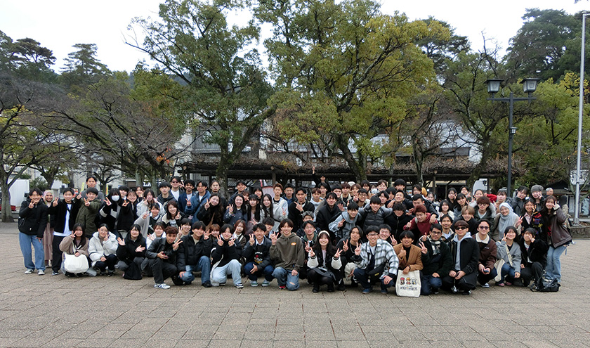 令和7年12月20日(土)、本校の集中的な国際交流期間である”U-Camp”の活動の一環として、異文化体験ツアーを実施し、冬の宮島を訪れました。今回は過去最大規模の参加となり、大型バス2台をチャーターして、短期留学生16名、本校の長期留学生5名、日本人学生67名および引率教員3名の総勢91名が参加しました。