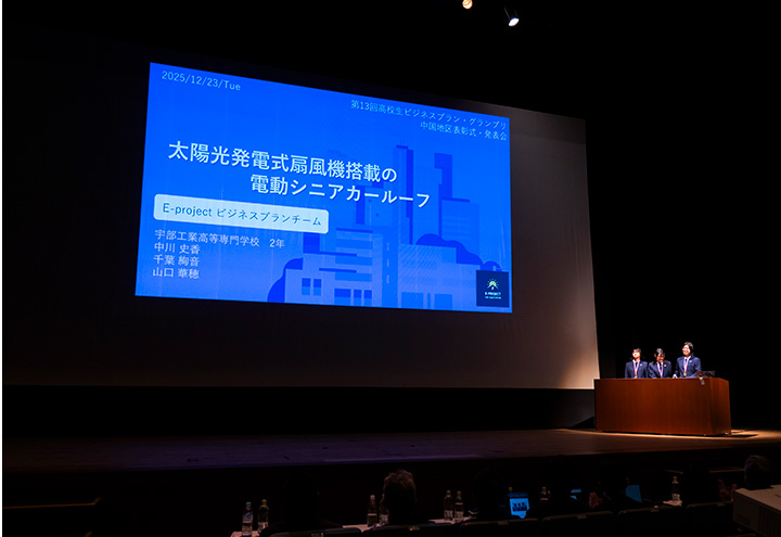 令和7年12月23日(火)、自主活動グループ電気工学科E-Projectのビジネスプランチーム(チームリーダー2E中川さん)が、第13回高校生ビジネスプラングランプリの中国地区表彰式・発表会に参加しました。