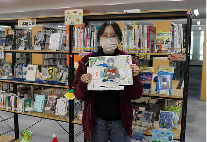今年度は 12作品 の応募があり、101名の学生および教職員による投票の結果、最優秀賞・優秀賞・佳作が決定しました。授賞式は図書館で行われ、最優秀賞・優秀賞の受賞者3名には、三澤学術情報室長より賞品として図書カードが贈呈されました。