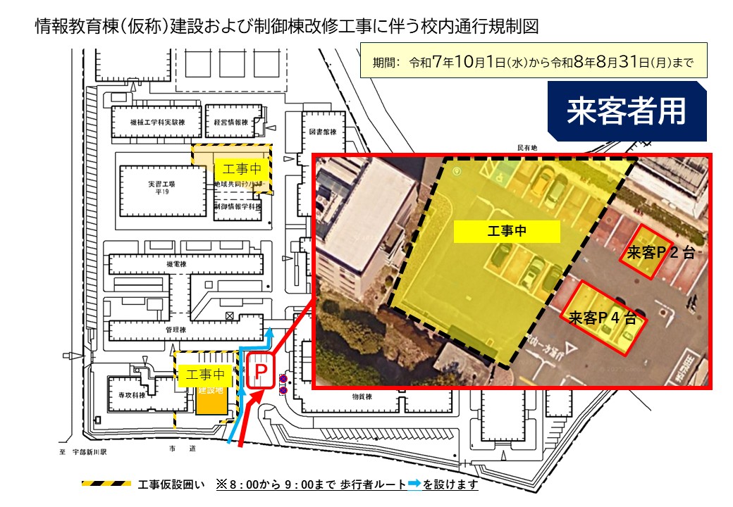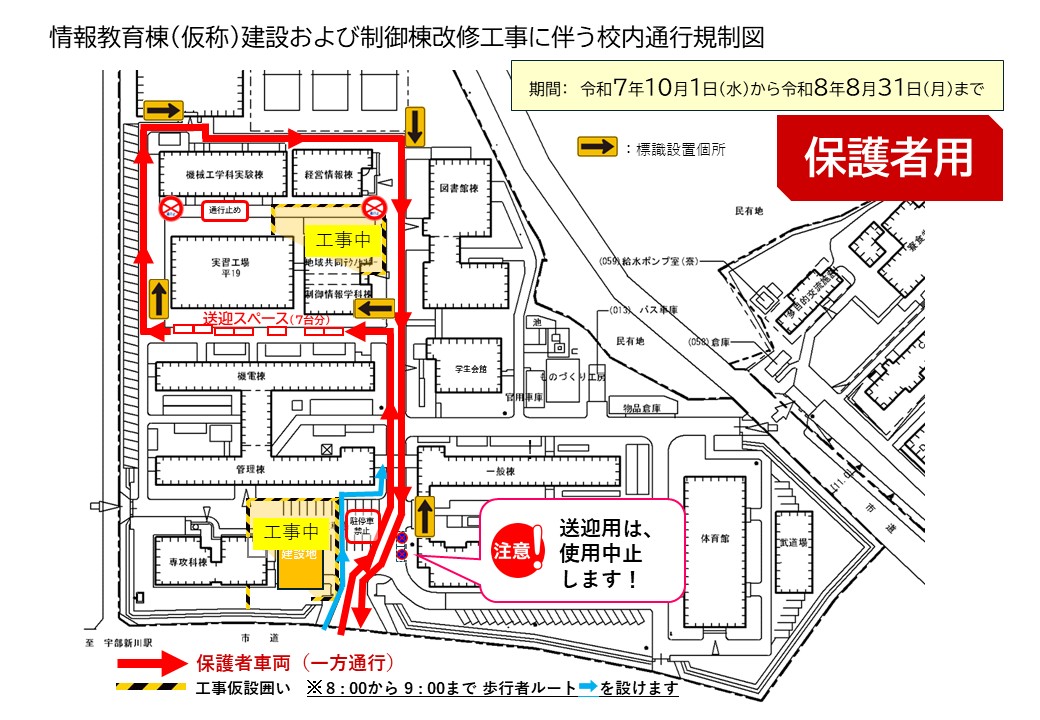 現在、本校では情報教育棟(仮称)の建設および制御棟の改修工事を実施しております。この工事に伴い、令和7年10月1日(水)から令和8年8月31日(月)までの期間、校内の駐車および通行に関して規制を行います。