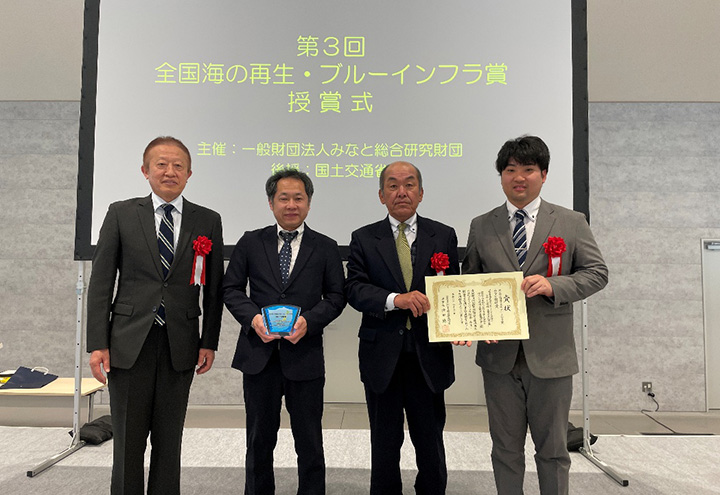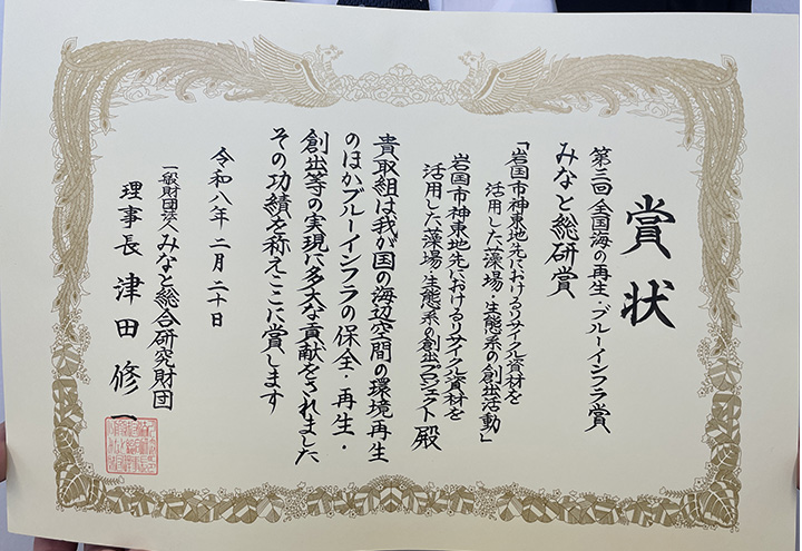 宇部高専は、神代漁業協同組合(山口県岩国市、以下、神代漁協)、岩国市およびJFEスチール株式会社(以下、JFEスチール)が共同で実施している「岩国市神東地先におけるリサイクル資材を活用した藻場・生態系の創出活動」が、一般社団法人 みなと総合研究財団主催の「第3回 全国海の再生・ブルーインフラ賞」*1の「みなと総研賞」を受賞しました。授賞式は、2月20日に広島港クルーズターミナル(広島県広島市)にて執り行われました。