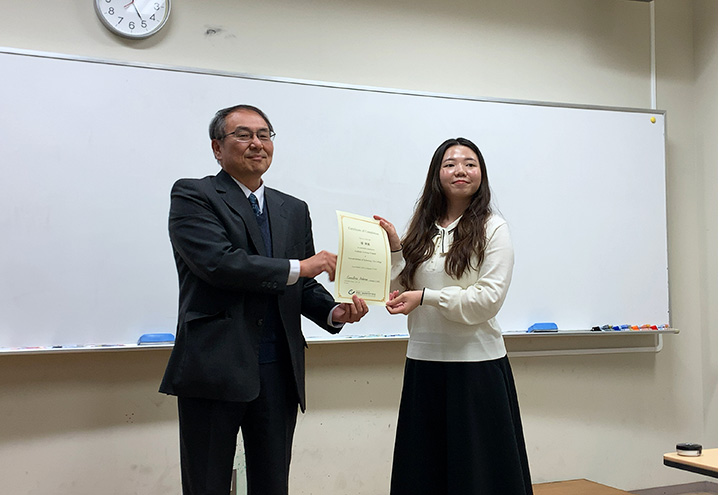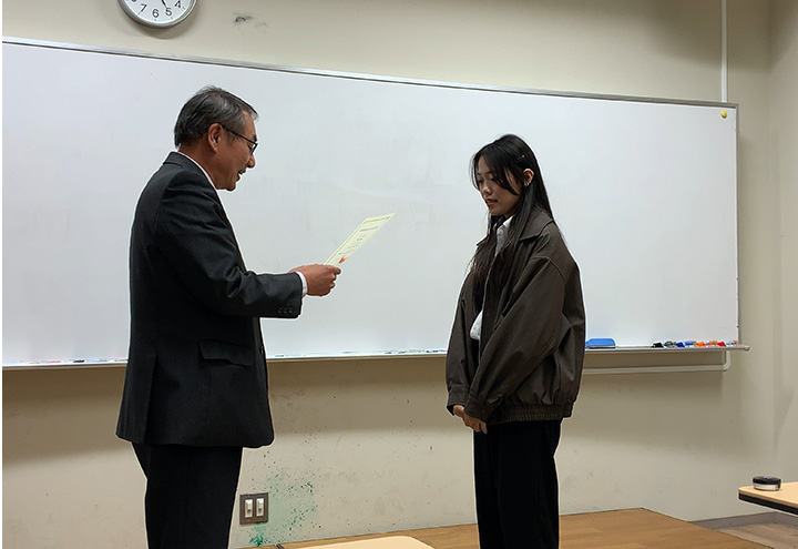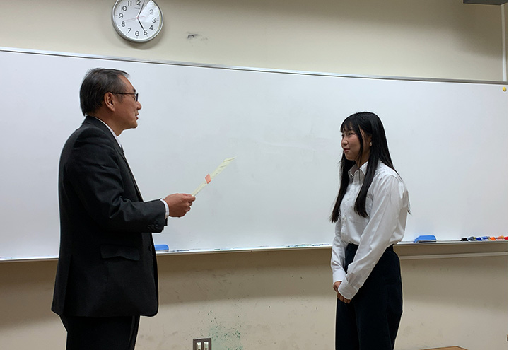 金寺登校長から実習証明書を受け取る楊婕儀さん