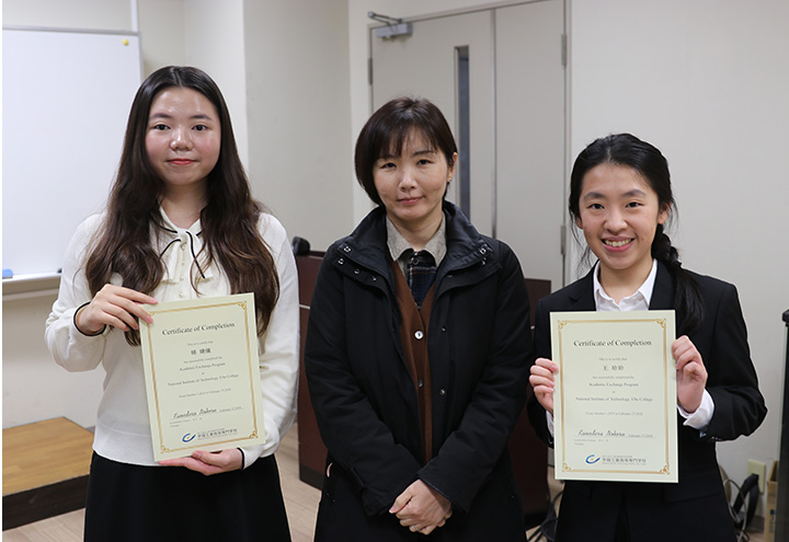 令和8年2月25日(水)、宇部高専で中国語と英語の教育実習を行っていた台湾の留学生4人が、5ヶ月の研修の成果報告を行いました。成果報告を行ったのは、台湾文藻外語大学(高雄市)応用華語系3年の張紋慈さん、葉子瑀さん、外語教育学系3年の楊婕儀さん、4年の王珍珍さんです。