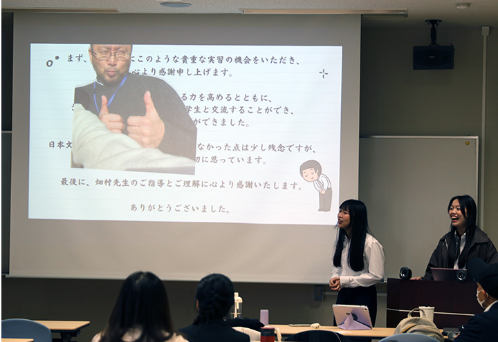 実習の成果報告を行う張紋慈さん(左)と葉子瑀さん(右)