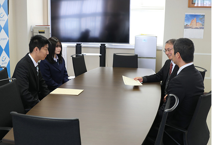 また3月26日(木)には、校長室で金寺校長に受賞の報告と本チームの取り組みの概要などを紹介しました。金寺校長からはねぎらいと激励の言葉が送られました。