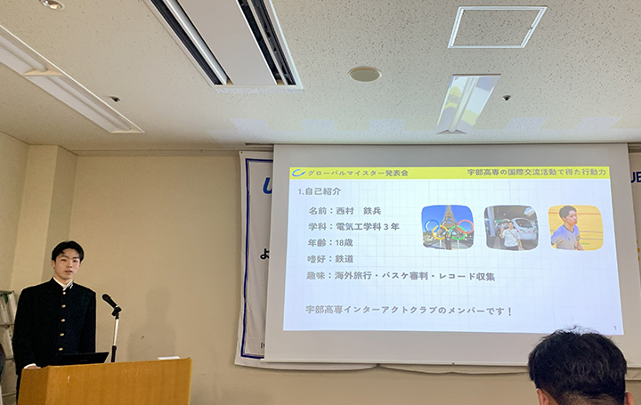 2017年度に始まった宇部高専グローバルマイスターの認定制度では、今年度を含めてこれまで108名の学生が認定を受けています。グローバルマイスターには、2020年度より宇部ロータリークラブより「内良(うちら)奨学金」が授与されることになりました。今回、本年度グローバルマイスターに認定された9名のうち2名の学生が報告を行いました。