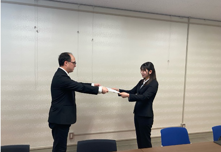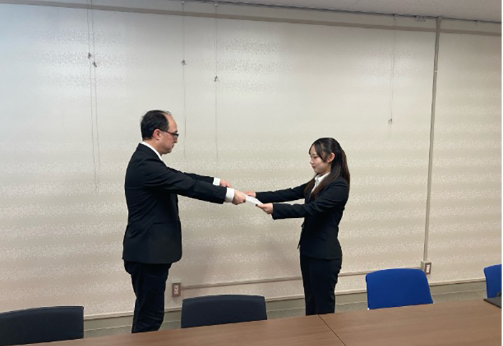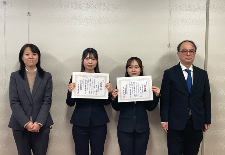 令和8年3月23日(月)に、宇部高専サイバー防犯ボランティアチームU3CPV(Ube College Cyber Crime Prevention Volunteer)の藤田 奈七さんと深水 音花さん(どちらも制御情報工学科5年生)が山口県警察本部生活安全部サイバー犯罪対策課長より感謝状が贈呈されました。この感謝状は、令和7年度に開催された大会等の成績や、サイバー空間の浄化活動に取り組んだ日頃の活動に対して贈呈されたものです。