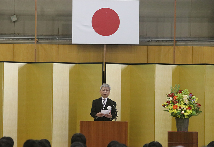 続いて、宇部高専同窓会である一般社団法人宇部しらとり会 会長の磯村様より祝辞を賜りました。本科入学生に対しては、高専は高等教育機関であり、受動的な「生徒」ではなく、主体的に学ぶ「学生」としての姿勢が求められること、高専の自由とは自分勝手であることではなく、自律性に基づくものであることが述べられました。また、学習における主体性と日常行動における自律性が、将来社会で活躍するために不可欠であることが強調されました。専攻科入学生に対しては、自分の考えを持ち、教員と議論できる学生となること、限られた2年間を密度の濃い学生生活として過ごし、貴重な友人関係を築いてほしいとの期待が寄せられました。