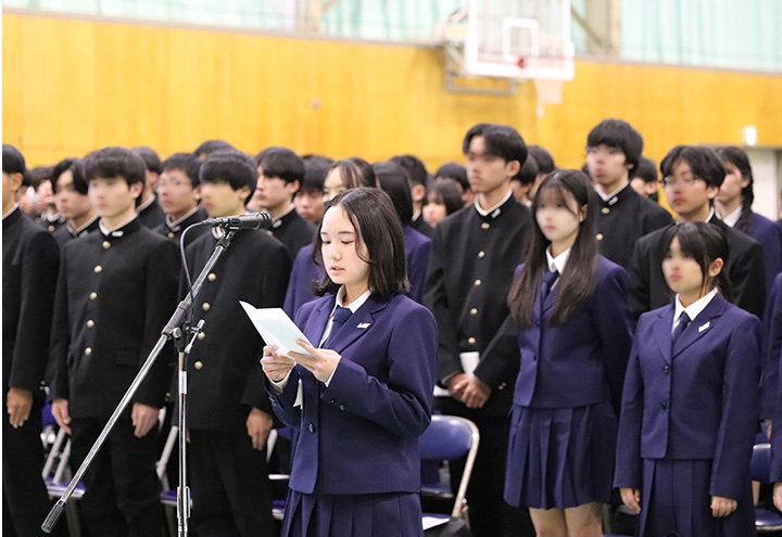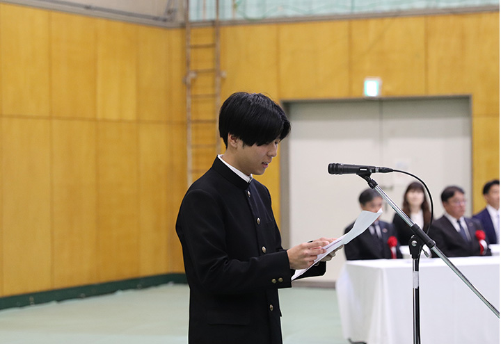 新入生代表・電気システム工学科の長野紗和さんが、「本校設立の目的および使命を確認し、人格の向上と学問・技術の研鑽に努め、進んで産業文化の発展に尽くすこと。また、学生の本分を体し諸規則を守り、本校学生としての責任を全うすること」を力強く宣誓しました。